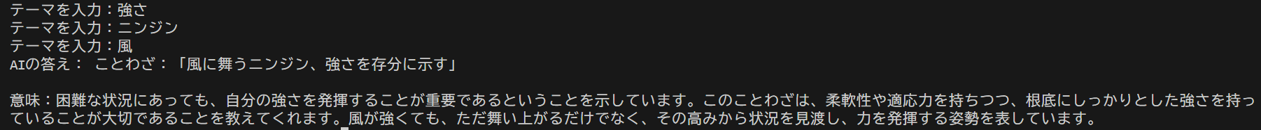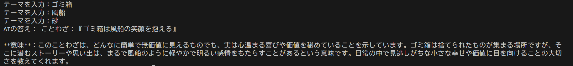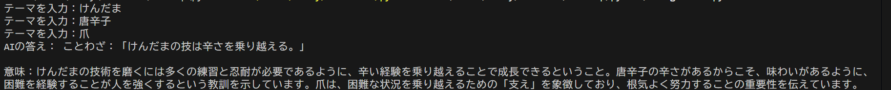 3回実行すると1回だけすべてのテーマを組み込んだことわざが完成した。